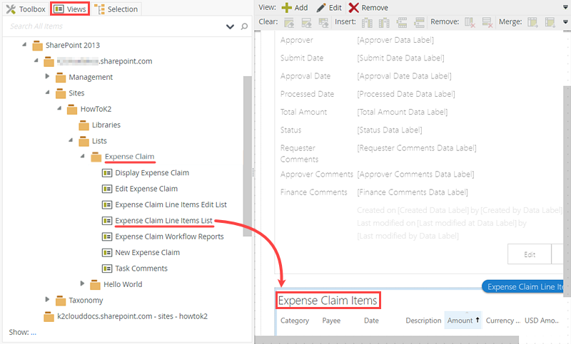 - Click the Views tab in the left column. Navigate to the Expense Claim category, then drag the Expense Claim Line Items List view to the bottom of the form. Change the title of the view to: