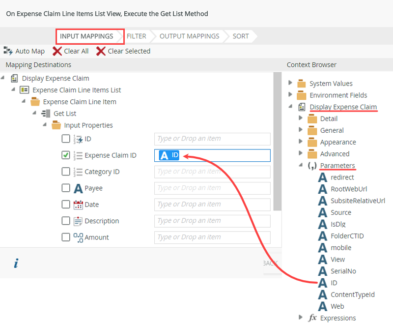 - Next, you will map the header record ID. Click (configure). You only want to show the line items associated with this specific expense claim, so on the Input Mappings screen, drag the ID Parameter into the Expense Claim ID input property.