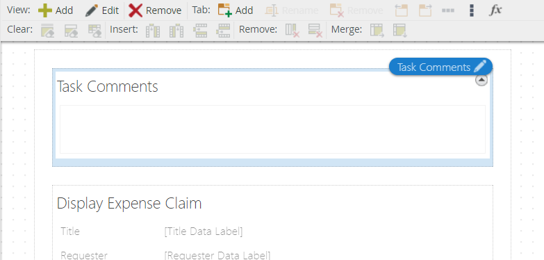 - To complete the display form, you will add the Task Comments view to the top of the form. The display view in its current state is read-only. You need to provide a way for approvers and finance processors to enter any questions or comments they may have. The Task Comments view is editable, so you will add it to the form.