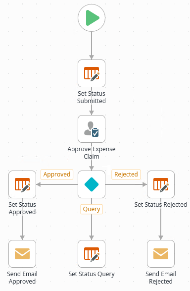In this step, you will add and configure the first Task step, used to approve or reject the claim. This step has three action options: Approved, Rejected, and Query. You will update the status column for each of the action outcomes, then send an email to the originator for the Approved and Rejected outcomes. Overall, you will configure the workflow as follows: