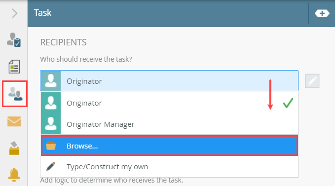 Click the Recipients tab. By default, the recipient is Originator. You want to change this to the SharePoint group. Click anywhere in the Originator box to expose the drop-down menu, then select Browse.