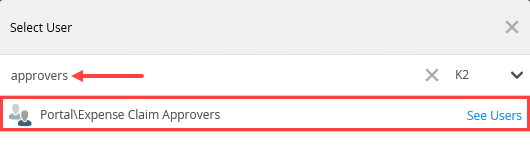 into the search box. K2 resolves search results as you type. Select Expense Claim Approvers when you see it returned. Select the group, then click OK.