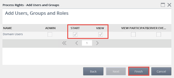 - CHECK the boxes for START and VIEW, then click Finish. Start rights allows the user to start an instance of a workflow. View rights allow the user to view reports for workflow instances they are associated with.