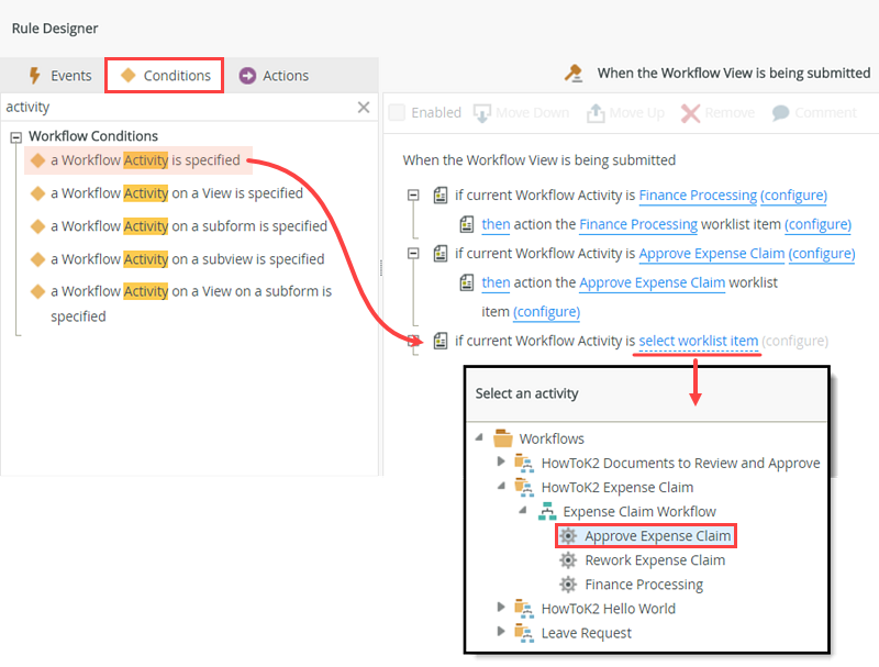 - Begin by setting a condition that checks to see if the current step is the Approve Expense Claim task. In the Conditions tab, locate and select the a Workflow Activity is specified condition to add it to the rule definition pane. Use the select worklist item link to select the Approve Expense Claim activity. Because you have two possible tasks (or steps) that you could reference in your rules (the approve task and the finance processing task are both using this Display Expense Claim form), you need this condition in place so that you can tell K2 you are referencing the approve step for the subsequent actions.
