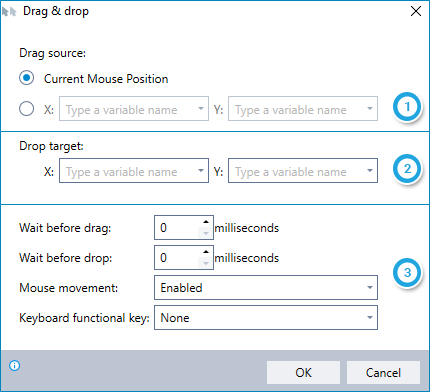 Pick up an object at a source location (either the current mouse position or a specific screen location identified by x and y coordinates) and drag it to a target location.