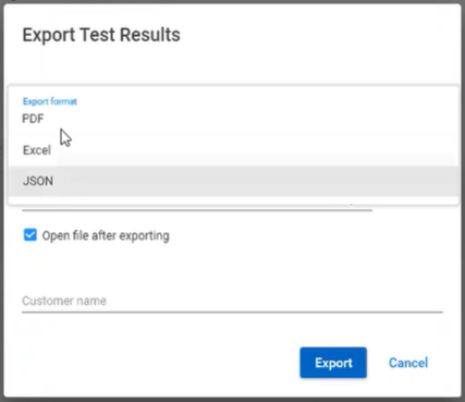 This output can be exported in PDF, Excel, or JSON format from the Export button on the upper right side.