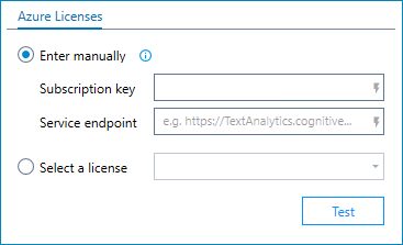 To enter license information manually, enter the subscription key and service endpoint, as provided by Microsoft. These fields can accept free text or values stored in variables.