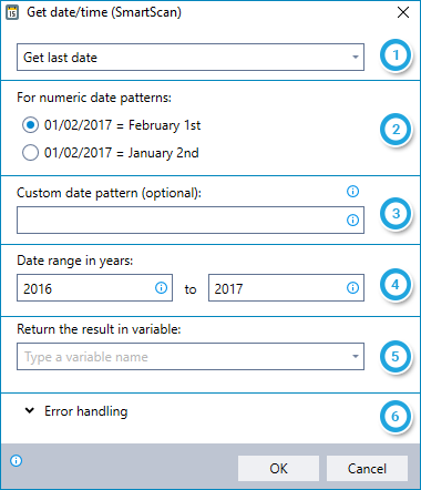 1. Select which date to retrieve from the scanned document: the last date, the first date, or any date that appears.