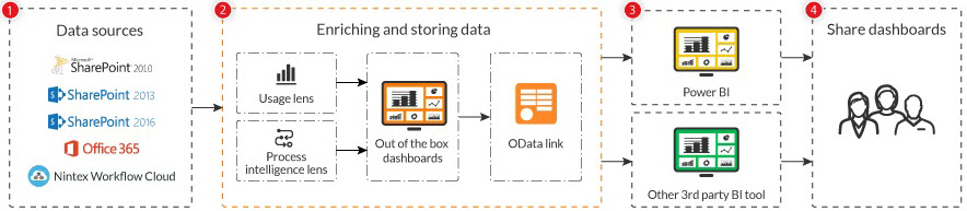 Generate interactive reports and dashboards using best-in-class visualization tools like Microsoft Power BI. Nintex Hawkeye also integrates with other business intelligence tools that support industry standard OData APIs.