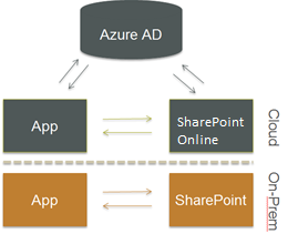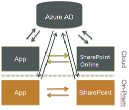 The authentication path of the OAuth token system in a hybrid environment (online and on-premises) adds the three legged path between the App, Azure AD, and the on-premises SharePoint server.