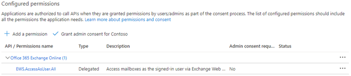 - Navigate down to EWS and click the checkbox for EWS.AccessAsUser.All, then click the Add permissions at the bottom of that pane.