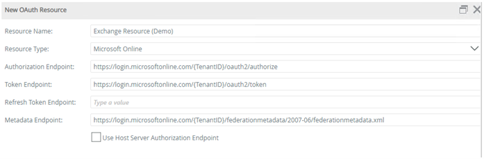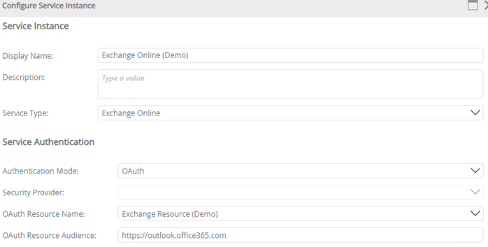 Create a new instance of the Exchange Online service type and configure it to authenticate using the OAuth resource you created earlier.