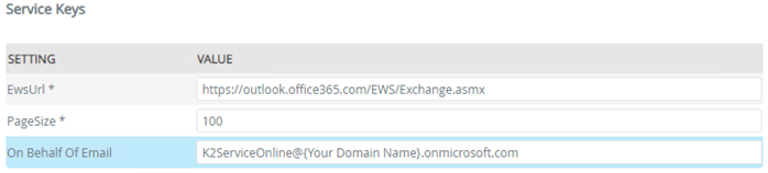 - On Behalf Of Email: Your Microsoft 365 K2 Service Account email address