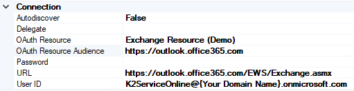 SourceCode.MessageBus.Ews.ExchangeWebServicesConnection (Your Microsoft 365 K2 Service Account email address)