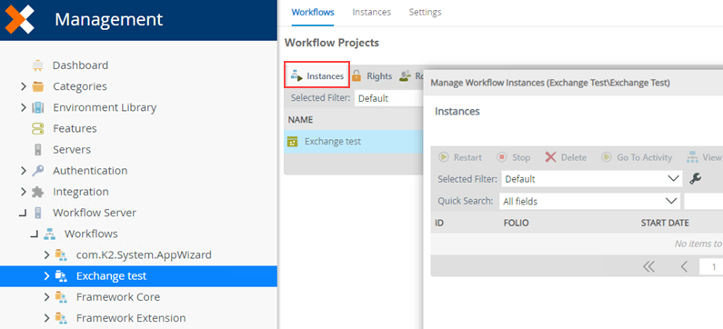 - Create a new workflow called Exchange Test, in a new folder also called Exchange Test.