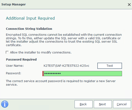 The installer performs a set of environment tests to ensure all config settings are correctly in place before setup or upgrade proceeds. These consist of SQL connection string validation and collecting credentials needed for specific service operations. For example, if the SQL connection string is missing a required encryption property, the installer will prompt you to provide permission to automatically update the refresh connection string to meet current security requirements.
