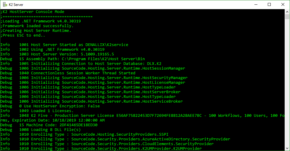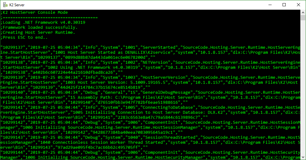 To troubleshoot issues in the hosted services inside the product service, you can run the product application service in console mode and/or enable logging output with various output targets and levels of verbosity. Several standard logging providers are available in the product, and you can create customized extensions to fit your needs. You can also choose which extensions are active and the message severity level (LogLevel) that is logged. To change the server logging configuration, edit the logging extension properties in the HostServerLogging.config file in the [Program Files]\K2\Host Server\Bin folder.
