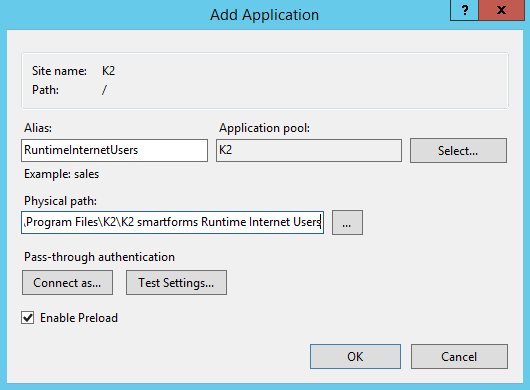 - In Internet Information Services Manager (IIS), under the K2 site, add a new application. Ensure the Application pool value is the same as the original runtime application and that it is a .NET 4 application pool.