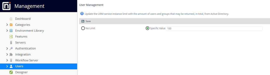 The AD user manager returns all results for the queries passed to it. You can limit the number of users and groups returned for better performance if you have a large directory. Use the User Management page on the Users node of the Management site to limit the number of users returned. The default value is 100 when specifying a limit.