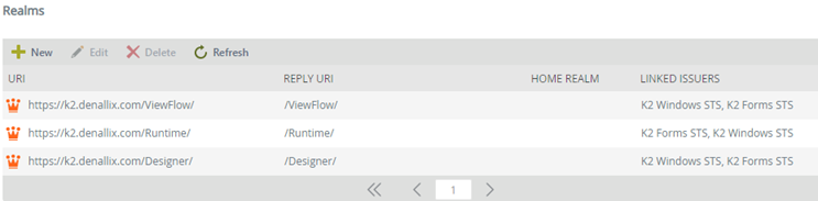3. Edit each Realm to add the K2 Forms STS to each Realm, the final result is shown below: