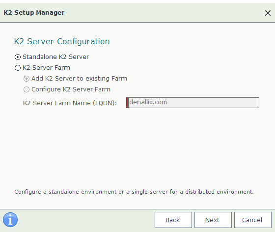 - If you are installing K2 Server in a distributed environment but there is only a single server playing the K2 Server Role, select Standalone K2 Server.