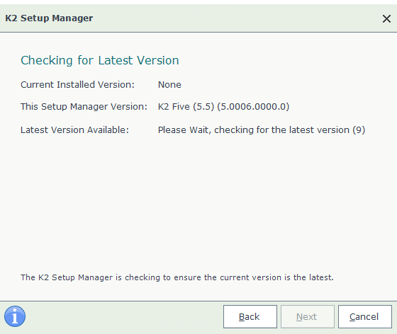After showing the Welcome page, the K2 Installer verifies online whether the version you are installing is the latest available. Even though you may be installing the latest major version of K2, there may be an update which includes enhancements or fixes.