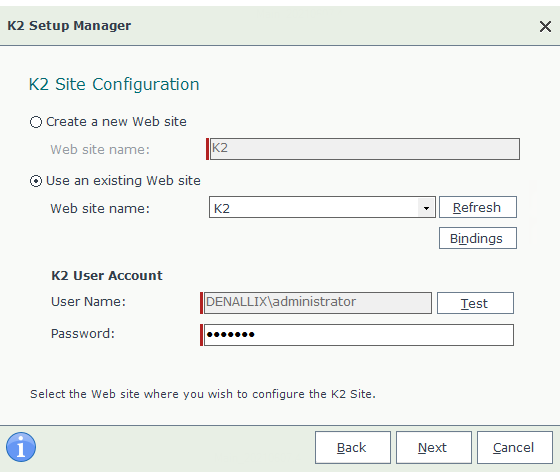 The name of the site created under IIS. Use the Bindings button to select which binding to use. Note: You can create the site without closing the K2 Setup Manager. Click Refresh to reload the list of available web site options. |