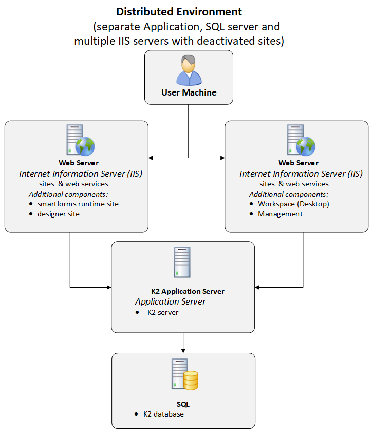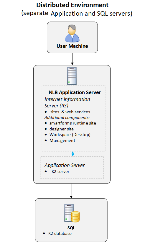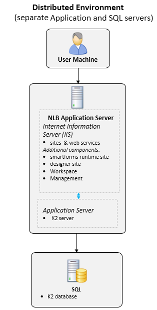 A distributed environment consists of separate IIS, Application and SQL servers.