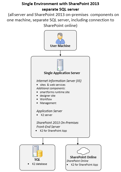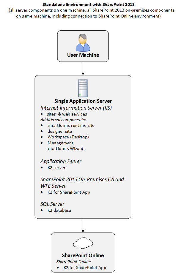All product components, IIS, SharePoint, and the database instance are installed on the same physical platform with connection to SharePoint Online if required.