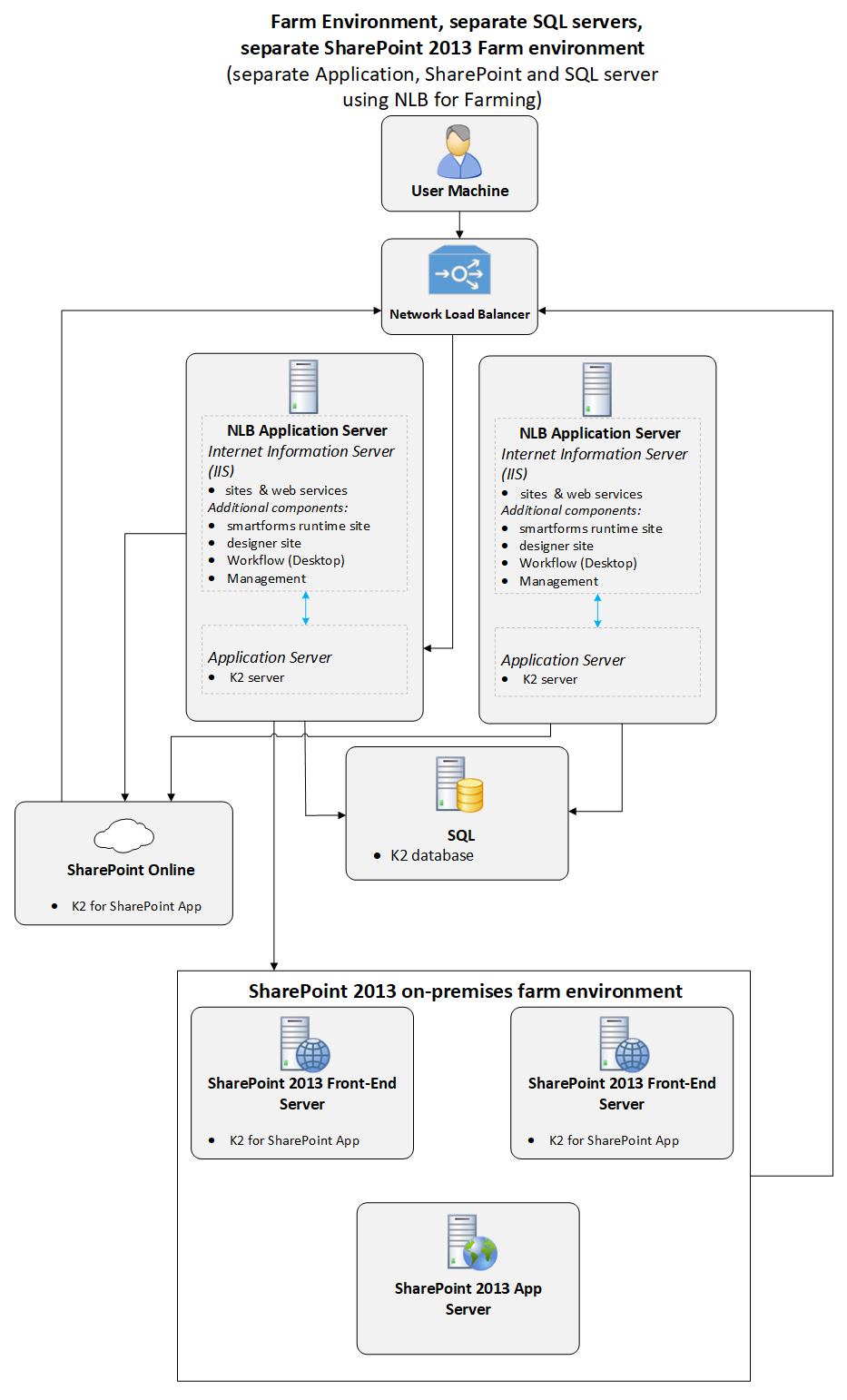 The following section discusses the deployment of the product components and Nintex K2 for SharePoint components in a Farm/NLB topology. (Due to the nature of a farm environment and its extensibility, the following is just an example of a basic farm set up.) When implementing a farm topology, configuration of Network Load balancing is required.