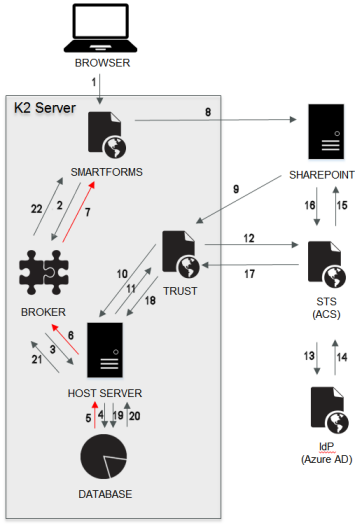 The app (1) sends an authentication request through the broker layer (2) to the server (3). The server then interrogates the database (4) for an access token. If an access token is not stored for that user (5) then it returns the request (6) with the No Token condition (7). Smartforms then initiates (8) the trust dialog with SharePoint. If the user selects to Trust the app (9), a trust request is then sent to the server (10). The server sends a trust request (11) to the STS (12), which authenticates the user using Active Directory and SharePoint (13-16), and returns an access token through the Trust site (17) to the server (18). That access token is then stored in the database (19) and a valid token condition is then returned to smartforms (20-22).