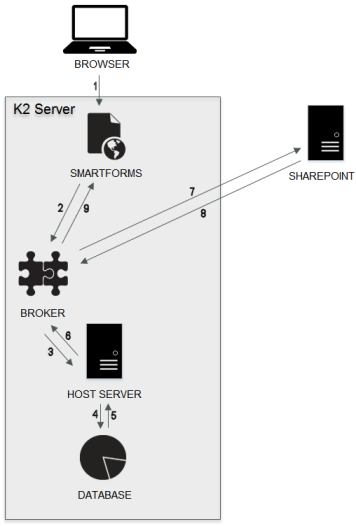 The app through smartforms (1) sends an authentication request through the broker layer (2) to the server (3). The server then interrogates the database (4) for an access token. The access token that is stored in the Database for that user (5) is returned through the broker (6) to SharePoint (7). SharePoint then uses the token to authenticate the action, and SharePoint data is then returned to smartforms (8-9) and displayed in the app.
