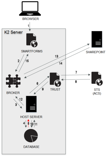 The app through smartforms (1) sends an authentication request through the broker layer (2) to the server (3). The server then interrogates the database (4) for an access token. The access token that is stored in the Database for that user has expired so an Expired Token condition is returned to the server(5). The server initiates a Refresh Token request through the Trust site (6) to the STS (7). The STS issues a new Access Token (8) which is returned to the K2 server (9) and stored in the database (10). That is returned through the broker (11-12) to SharePoint (13). SharePoint then uses the token to authenticate the action, and SharePoint data is then returned to smartforms (14-15) and displayed in the app.