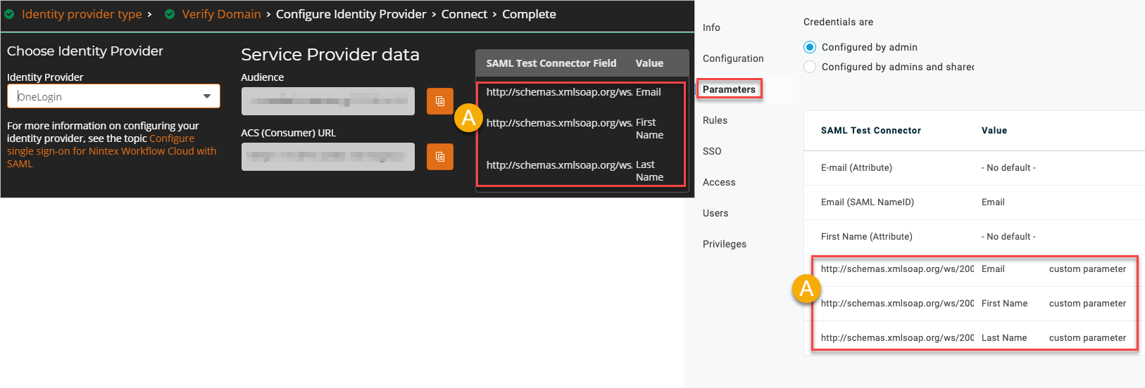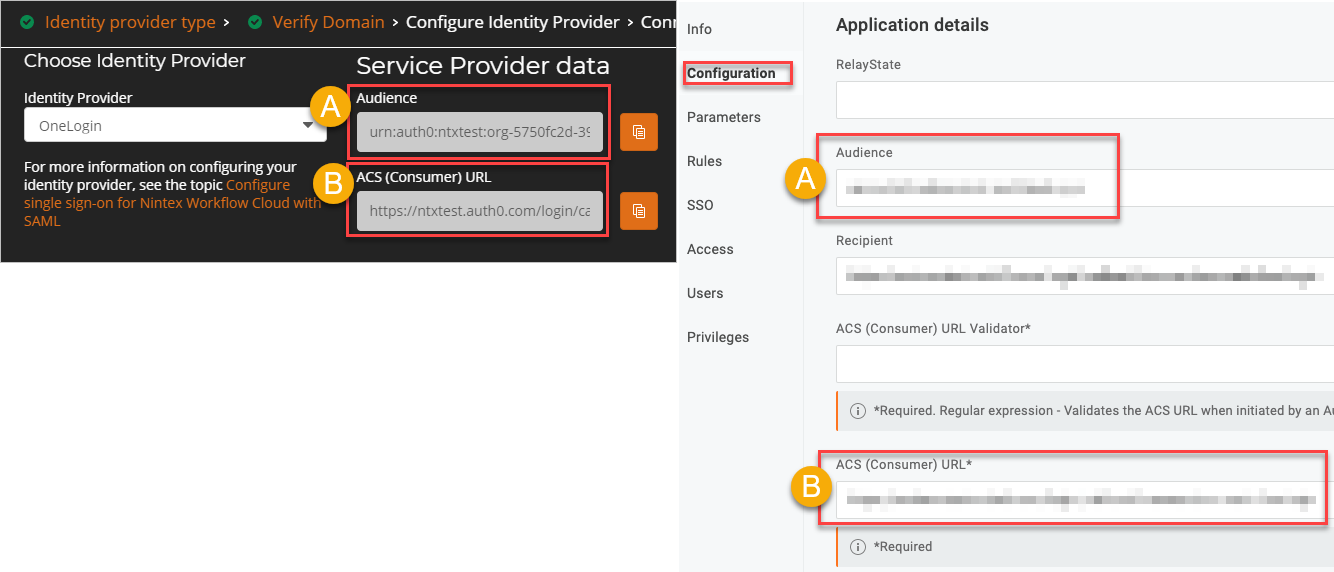 - Copy the Audience and ACS (Consumer) URL values, and the attribute statements from Nintex Workflow, and then paste them in the corresponding fields in OneLogin.