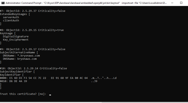 "C:\Nintex\IDP\Aerobase\Aerobase\embedded\openjdk\jre\bin\keytool" -importcert -file "C:\Users\LocalAdmin\Desktop\NintexCert.cer" -alias Nintex14-126.Nintexaws.com -keystore "C:\Nintex\IDP\Aerobase\Aerobase\embedded\openjdk\jre\lib\security\jssecacerts" -storepass changeit