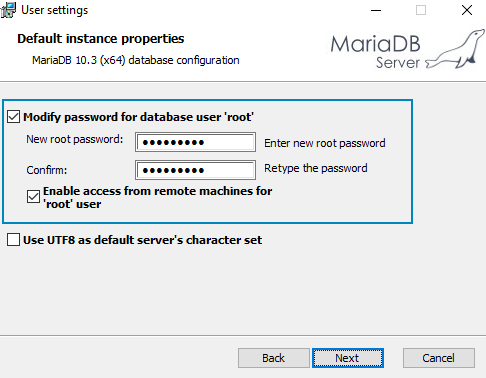 You should use the default options for each screen in the MariaDB installation wizard, with the following important exceptions: