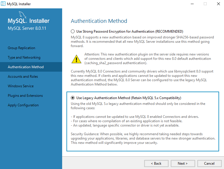 Select Use Legacy Authentication Method (Retain MySQL 5.x Compatibility)
