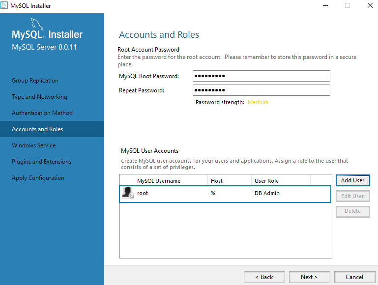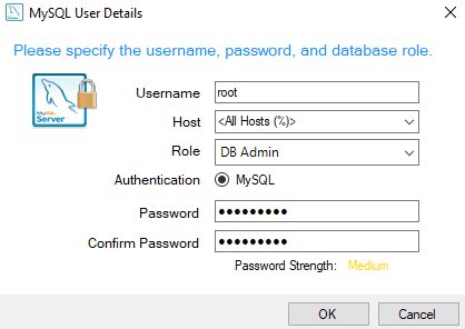 In the MySQL User Accounts section, click the Add User button, and create a user with the following properties: