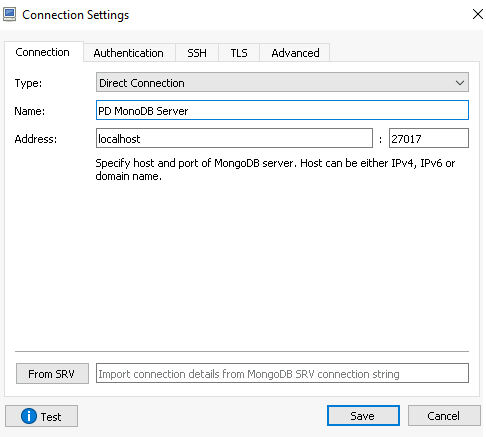 In the Connection tab, specify the MongoDB server FQDN and port.
