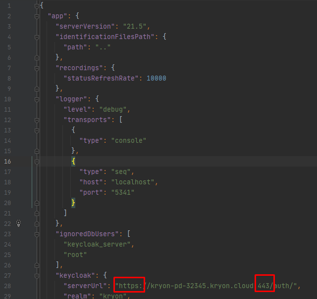 In the “keycloak” section, ”serverUrl” property value is https and the port is 443.